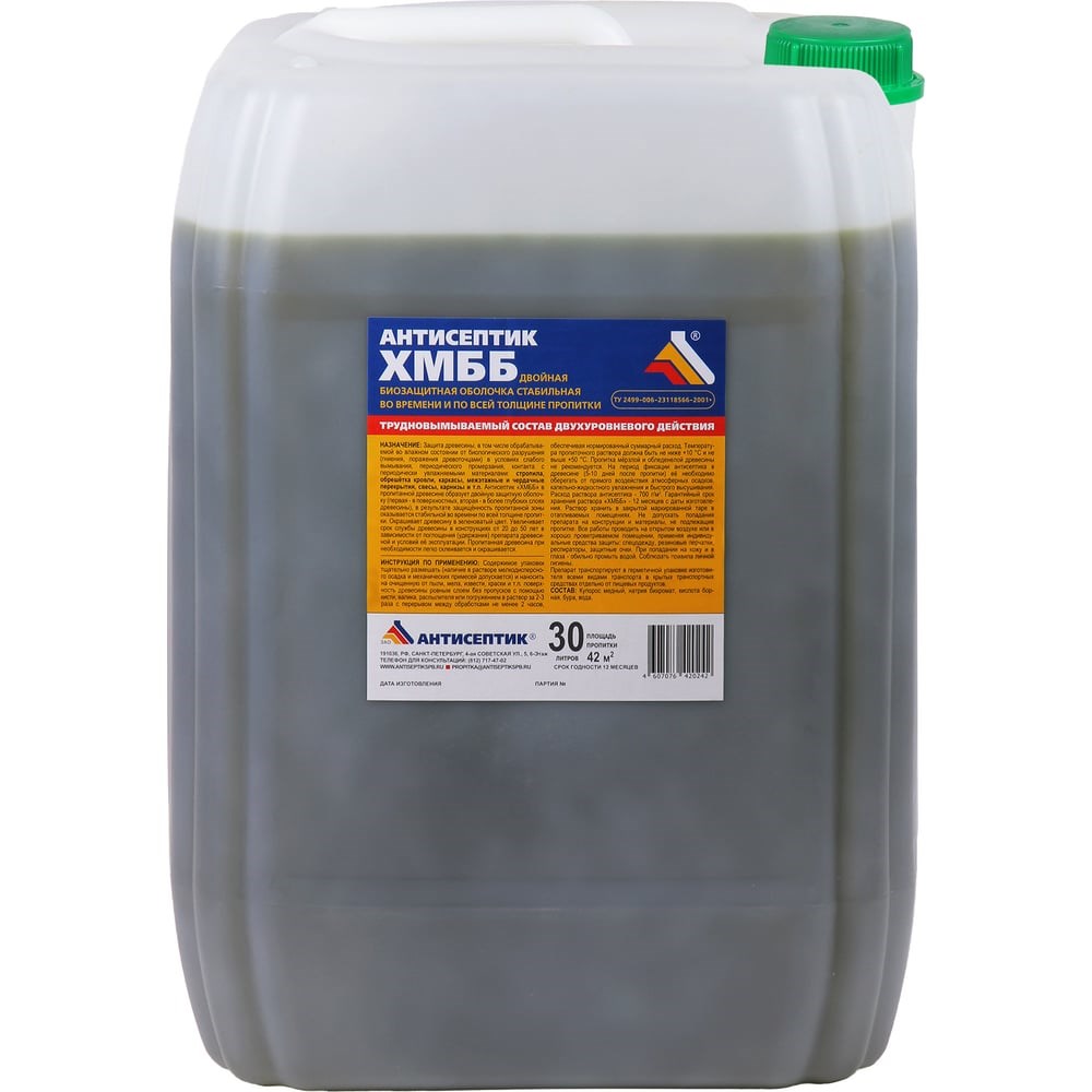 Раствор антисептика ЗАО "Антисептик" ХМББ 30 литров 00-00003731 обеспечивает биозащиту в условиях умеренного вымывания, периодического промерзания, контакта с периодически увлажняемыми материалами. Продукт наносится на обрешетку кровли, срубы, межэтажные и чердачные перекрытия, свесы, карнизы, под обшивку, муэрлат. Состав формирует двойную защитную оболочку (первая - в поверхностных, вторая - в более глубоких слоях древесины).
