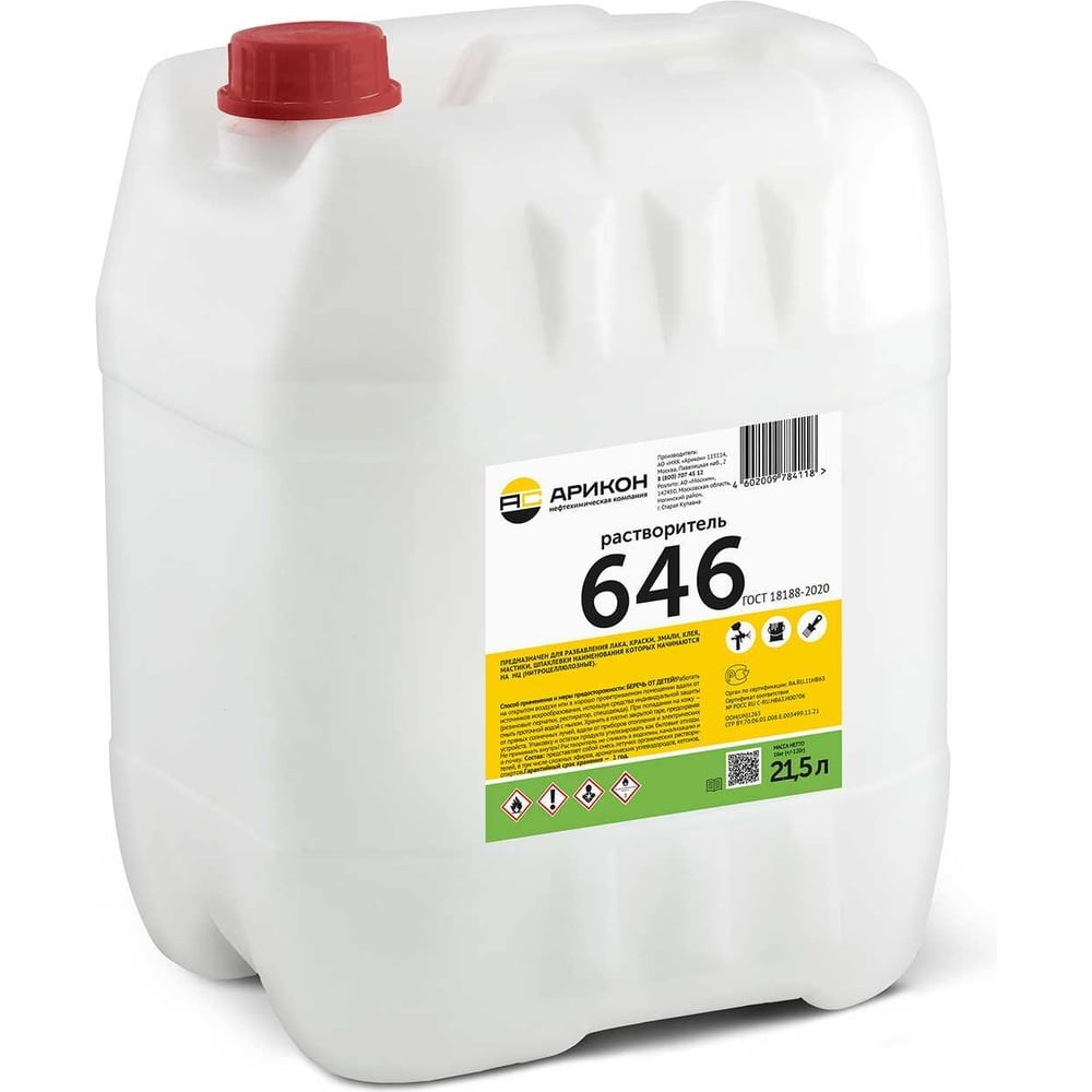 Растворитель Арикон Р-646 ГОСТ 18188-2020 канистра 21,5л RAS64621 применяется для:разбавления загустевшей краски, лаков, грунтовок, шпаклевок удаления пятен с кузова и деталей автомобиля от органических веществ.Отлично подходит для разбавления лаков, эмалей, грунтовок используемых для защиты от внешних воздействий на пластиковых, деревянных и металлических поверхностях.Используется для промывания и очистки:лакокрасочных инструментов: кистей, валиков, емкостей и пр. лакокрасочного технического оборудования: краскопульта, сопла, емкостей для краски и т.д.При применении краскопульта эмаль / лак / грунтовку разбавлять в зависимости от диаметра сопла и планируемой толщины пленки покрытия, согласно рекомендации производителя ЛКМ.