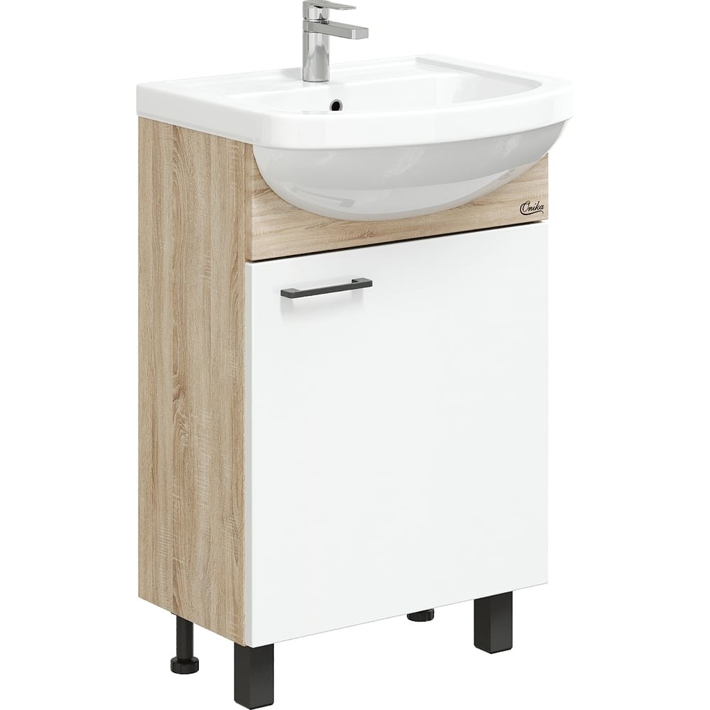 Тумба с раковиной Onika ЭКО-52 дуб сонома BLACK разборная 105209 - это идеальное сочетание минимализма, функциональности и цены. Компактные габариты позволяют грамотно организовать небольшой санузел, а белый фасад и корпус цвета дуба гармонично сочетаются с черной фурнитурой и отлично впишутся в интерьер любой ванной комнаты. Распашная дверца скрывает вместительное пространство для хранения, разделенное полкой. Тумба выполнена из ЛДСП, устойчивой к механическим воздействиям, перепадам температур и высокой влажности. Хромированная ручка и три ножки (2 декоративных хромированных и 1 пластиковая) идут в комплекте с тумбой.