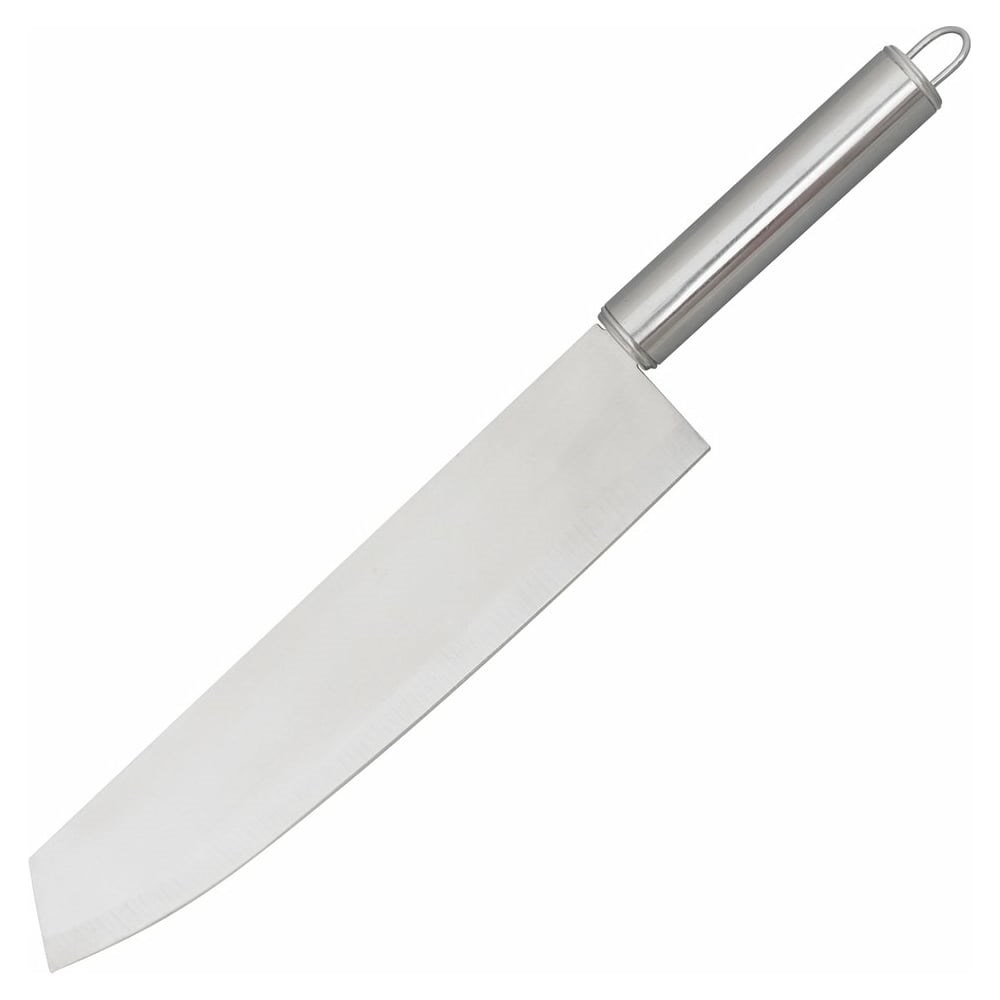 Разделочный нож МУЛЬТИДОМ Су-шеф общая длина 30 см, лезвие 20x4 см VL35-59 применяется для разделки сырого и готового мяса, курицы, рыбы, мясных полуфабрикатов, для нарезки и шинковки овощей и фруктов. Надежность. Изготовлен из нержавеющей стали, которая отличается устойчивостью к образованию коррозии.