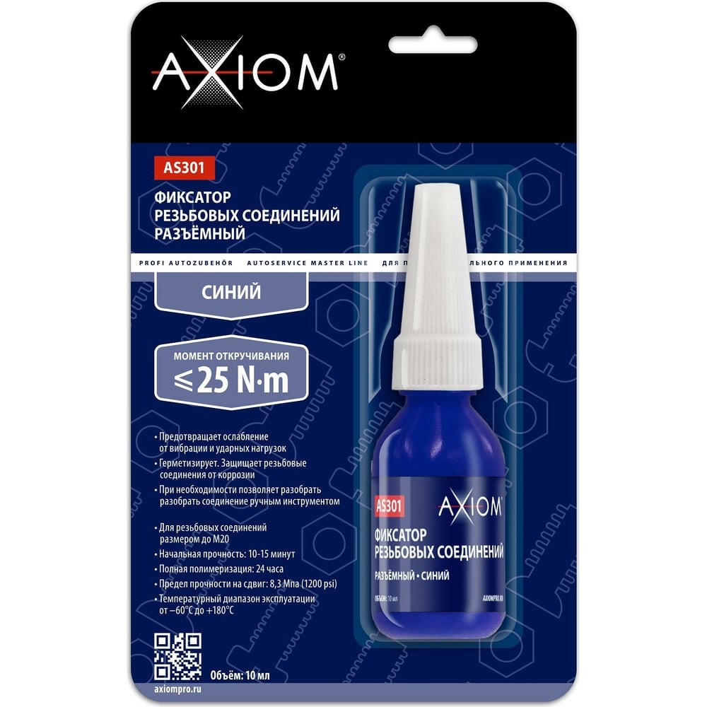 Фиксатор резьбовых соединений AXIOM разъемный синий 10 мл AS301 - это однокомпонентный анаэробный состав, который предназначен для фиксации и герметизации нуждающихся в регулярном техническом обслуживании с применением ручного инструмента резьбовых соединений, подверженных вибрации и ударным нагрузкам. Препятствует ослаблению и саморазвинчиванию крепежных соединений. Устойчив к воздействию автомобильных технических жидкостей (масла, тормозной жидкости, антифриза, бензина, дизельного топлива и др.). Предотвращает коррозию резьбы. Фиксатор резьбы AXIOM® AS301 полимеризуется без доступа воздуха в зазорах до 0,13 мм. Температурный диапазон эксплуатации отвержденного фиксатора от –60°C до +180°C. Момент откручивания на незатянутой резьбовой паре не более 25 Н·м. Предел прочности на сдвиг – 8,3 МПа (1200 psi). Предназначен для крепежных элементов размером до М20. Предотвращает ослабление от вибрации и ударных нагрузок. Герметизирует. Защищает резьбовые соединения коррозии. При необходимости позволяет разобрать соединение ручным инструментом Для резьбовых соединений размером до М20 Начальная прочность: 10-15 минут Полная полимеризация: 24 часа Предел прочности на сдвиг: 8,3 МПа (1200 psi) Температурный диапазон эксплуатации от –60°С до +180°С