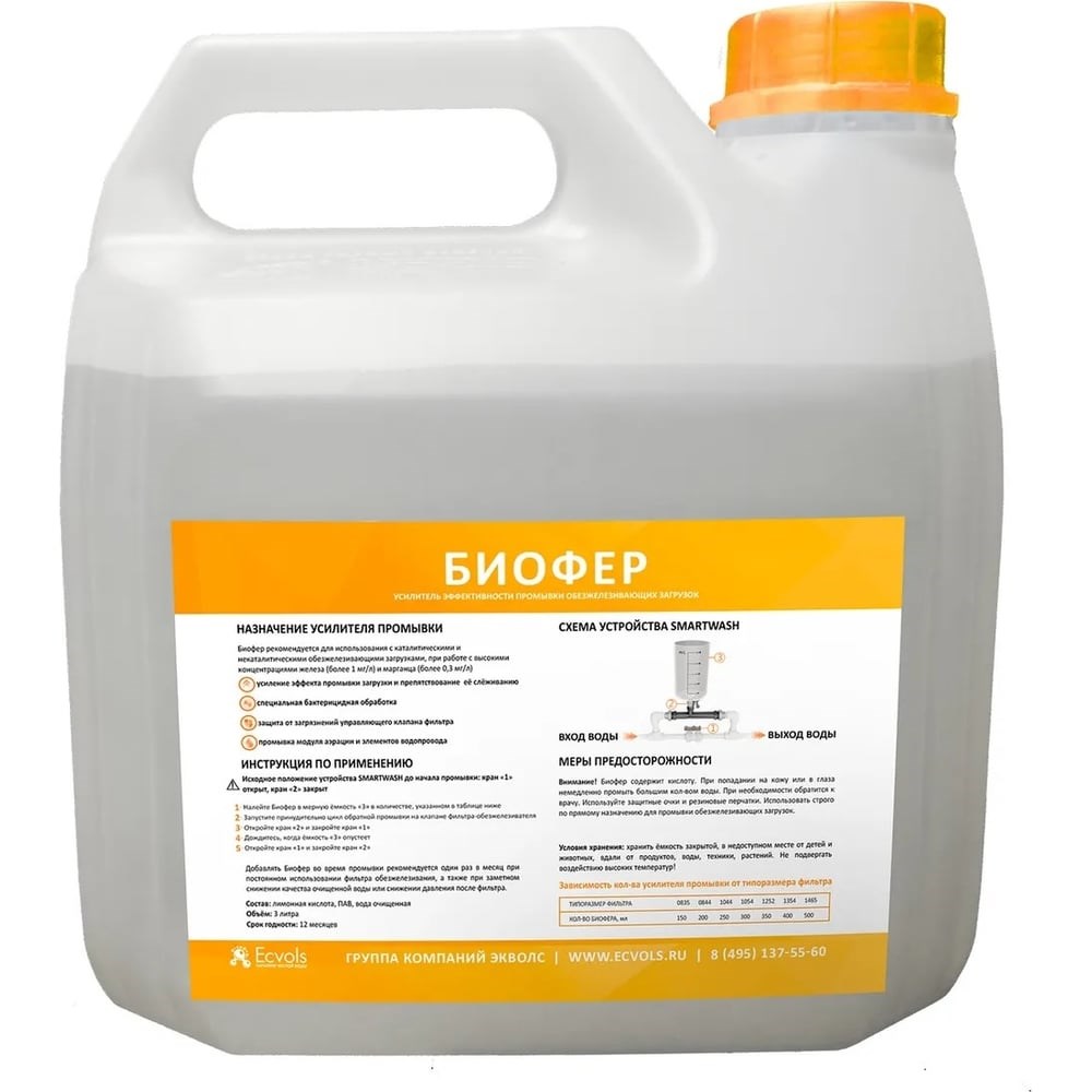Реагент BioFer предназначен для регенерации каталических и некаталических обезжелезивающих загрузок, смол для фильтров. Обеспечивает полное очищение и восстановление засыпки в фильтр. Дополнительно к промывке засыпки очищает фильтр системы очистки (клапаны управления). Возможна работа с высокими концентрациями железа и марганца - более 1 мл/л и 0,3 мл/л соответственно.Промывка картриджа фильтра необходима, чтобы повысить качество очистки и продлить работу фильтрационной системы и наполнителя. BioFer обладает прекрасными дезинфицирующими свойствами и усиливает эффект промывки. Реагент крайне простой и удобный в использовании, подробная инструкция напечатана на упаковке. Применяется для подготовки воды балонного типа в бытовой и промышленной сфере, очистки модулей аэрации от ржавчины, промывки фильтра и сервиса трубопровода/фитинга. Фасовка в канистры по 4 литра.