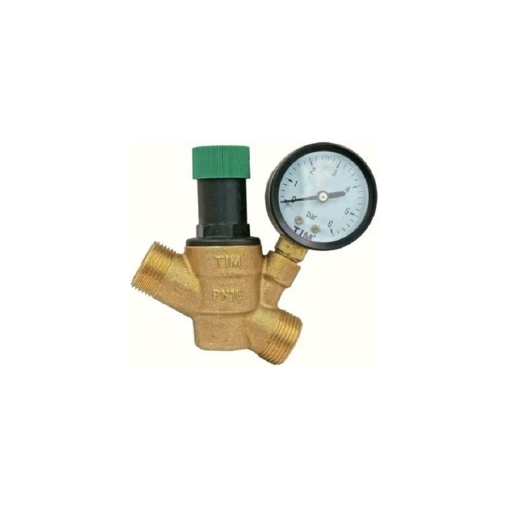 Редуктор давления с манометром TIM разработан для применения в системах водопроводных сетей в многоэтажном и индивидуальном строительстве, для стабилизации давления, защиты сантехнических приборов от гидравлического удара. Редуктор давления с манометром TIM выгодно отличается качеством изготовления и надежностью при длительной эксплуатации. Предназначен для защиты систем водоснабжения и отопления от превышения давления путем уменьшения его на входе. Особенно актуальна установка редуктора TIM в системах водоснабжения и отопления, где скачки давления больше 1 бар и могут достигать больших величин. 100% защита от гидроударов. Корпус редуктора изготавливается из латуни CW617N, устойчивой к вымыванию цинка. Все конструктивные элементы изготовлены из материалов, преимущество которых высокая стойкость к коррозии. Поршневые регуляторы давления не подвержены износу и могут иметь практически неограниченный срок службы. Толщина стенки корпуса 2 мм позволяет выдержать повышенное давление и усилие при монтаже клапана. Диапазон регулировки давления на выходе - 1,5 - 6,0 бар. Заводская настройка - 3 бар. Подключение манометра - 1/4"