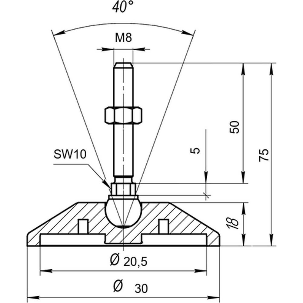 Материалы: Основание литое под давлением из полиамида ПА6-211/2М. Винт из нержавеющей стали AISI304 Исполнение: Полиамид черного цвета. Нержавеющая сталь без покрытия. Максимально допустимая нагрузка: 350 кг. Резьба: M8. Длина резьбы: 50 мм. Горючесть основания: HB (UL-94). Напряжение при разрыве основания: 70-80 МПа (ISO 527,50 мм/мин). Прочность при изгибе основания: 80-92 МПа (ISO 178,2 мм/мин).