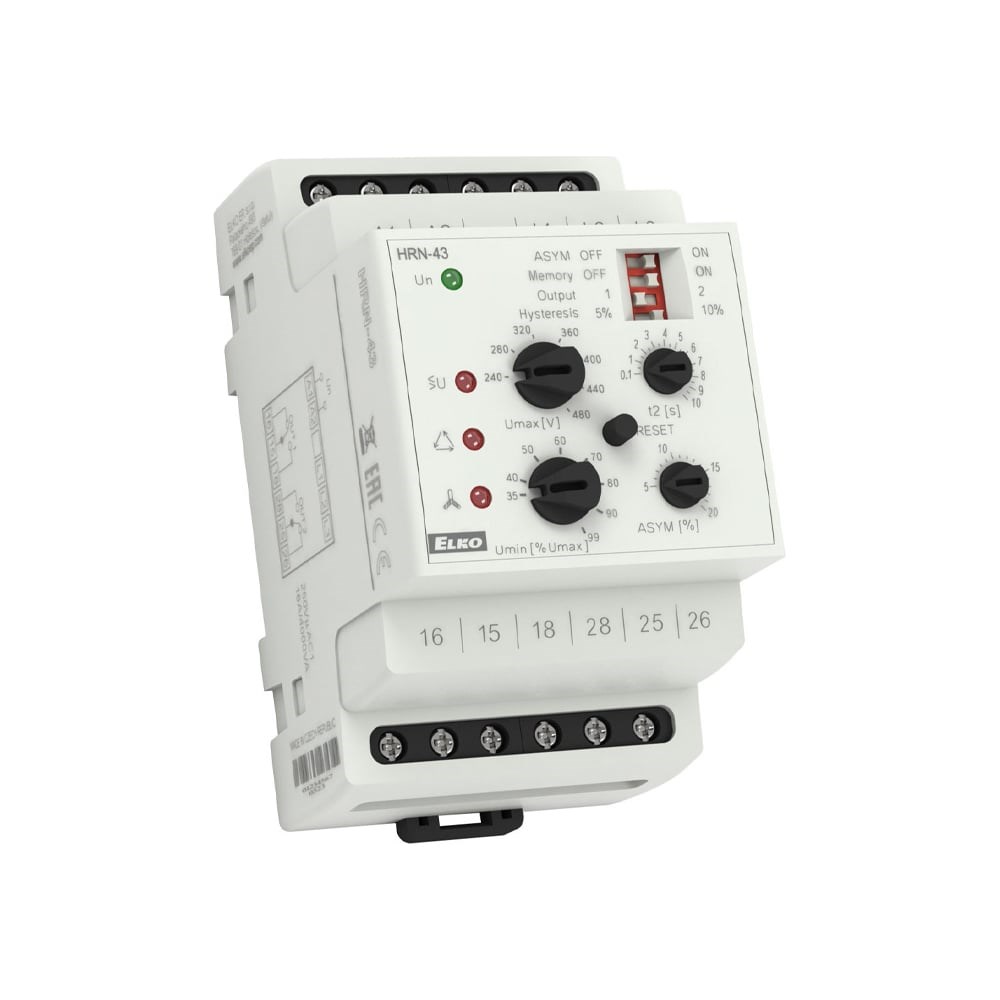 Дополнительные технические характеристики реле комплексного контроля напряжения ELKO HRN-43/400 AC 400V EP 00000000469: Реле контролирует в 3-фазный цепях: напряжение в двух уровнях (повышенное напряжение и пониженное напряжение) в пределах 138-276 V (система 3x400 V) Настраиваемая функция "Памяти" Функция второго реле (независимо/параллельно) Настройка задержки для устранения коротких выпадений напряжения и пиков независимо для каждого уровня Исполнение - 3 модуля, крепление на DIN рейку Защита - IP40 со стороны лицевой панели/IP20 клеммы