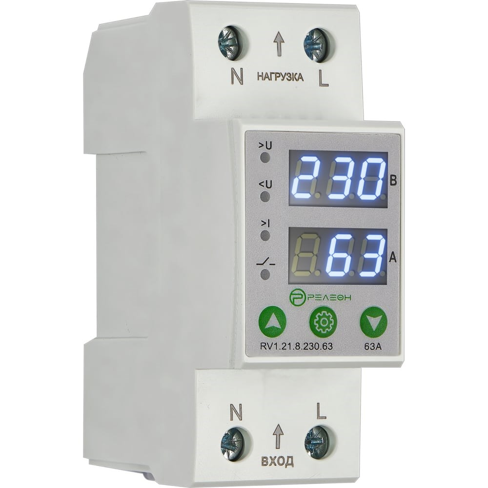 Реле контроля напряжения и тока RV1.21.8.230.63 предназначено для защиты сети (бытовой техники, холодильников, кондиционеров, компьютерной, теле-, видео- и аудиотехники и т.п.) от повышенного или пониженного напряжения в сети и последствий обрыва нейтрали (нуля), а также от превышения предельного значение тока.В случае перенапряжения или пониженного напряжения в сети, реле мгновенно отключит потребителя, чтобы предотвратить электрооборудование от повреждения.В случае превышения предельного значения тока, реле также отключит потребителя.Реле автоматически восстанавливает подключения потребителя с задержкой по времени после нормализации напряжения сети или нагрузки.Дополнительные характеристикиРабочее напряжение: 100-400В AC.Диапазон защиты от повышенного напряжения: 220-280В ACДиапазон защиты от пониженного напряжения: 140-210В ACДиапазон защиты от перегрузки по току: 1-63АВремя задержки вкл /сброса 5-600сВремя задержки срабатывания от перегрузки по току: 5-600сВремя срабатывания при повышенном напряжении: 0,2с.Время срабатывания при пониженном напряжении:≥120В: 0,2с; <120В: 0,1сПогрешность вольтметра: не более 2%Номинальное напр. изоляции: 400ВВыходной контакт: 1НОМакс. мощность нагрузки : 13,9кВтПамять сбоев: Последнее событиеMax сечение провода = 16 мм²Задержка отключения = естьНоминальная мощность нагрузки = 13900В*АВремя отключения нагрузки при превышении напряжения = 0.2 сВремя отключения нагрузки при снижении напряжения (не более) = 0.2 сКоличество фаз = 1