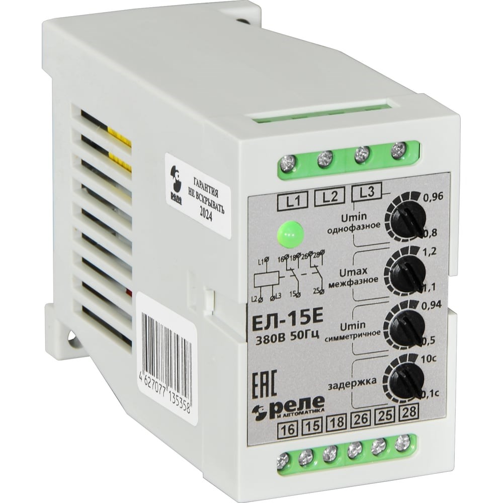 Реле контроля трехфазного напряжения Реле и Автоматика, ЕЛ-15Е 380В 50Гц A8222-77135358 с линейным напряжением 380 вольт используются для контроля источников и преобразователей электрической энергии, трехфазных асинхронных двигателей общепромышленных серий мощностью до 100 кВт. Реле ЕЛ-15Е контролируют: - однофазное снижение напряжения, с выдержкой времени (0.6…0.96)Uфн. - симметричное снижение фазных напряжений, с выдержкой времени (0.5…0.94)Uфн. - обрыв одной или двух фаз, с выдержкой времени. - обрыв трех фаз, без выдержки времени. - повышение межфазного напряжения, без выдержки времени (1.1…1.2)Uфн. - обратный порядок чередования фаз, без выдержки времени. - «слипание» фаз, без выдержки времени.