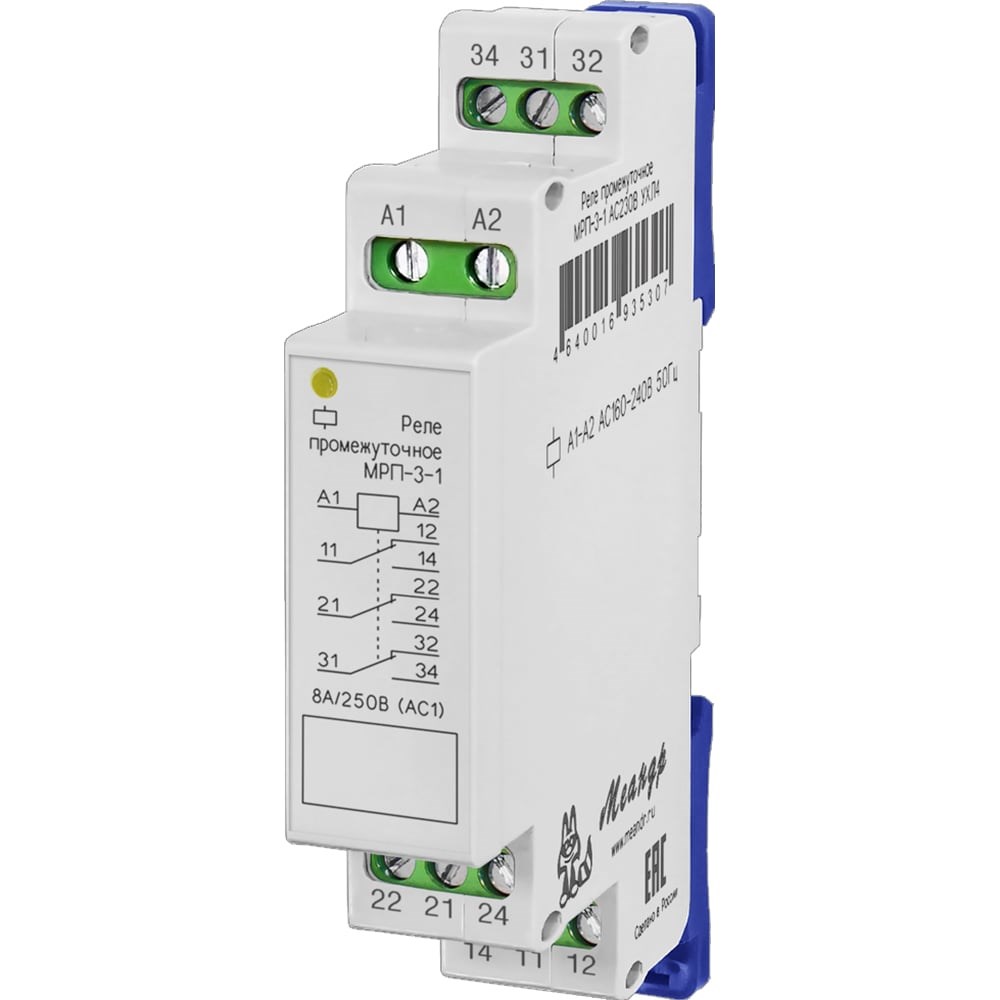 Реле промежуточное МРП-3-1 (артикул A8302-16936618) предназначено для гальванической развязки между силовыми цепями и цепями управления дистанционного включения нагрузки путём подачи управляющего напряжения на вход реле, а также для использования в качестве промежуточного реле.Основные особенности:Индикация состояния выходаВстроенная защита коммутирующего элемента от индуктивных выбросов, возникающих при размыкании реле3 переключающих контакта (7А)