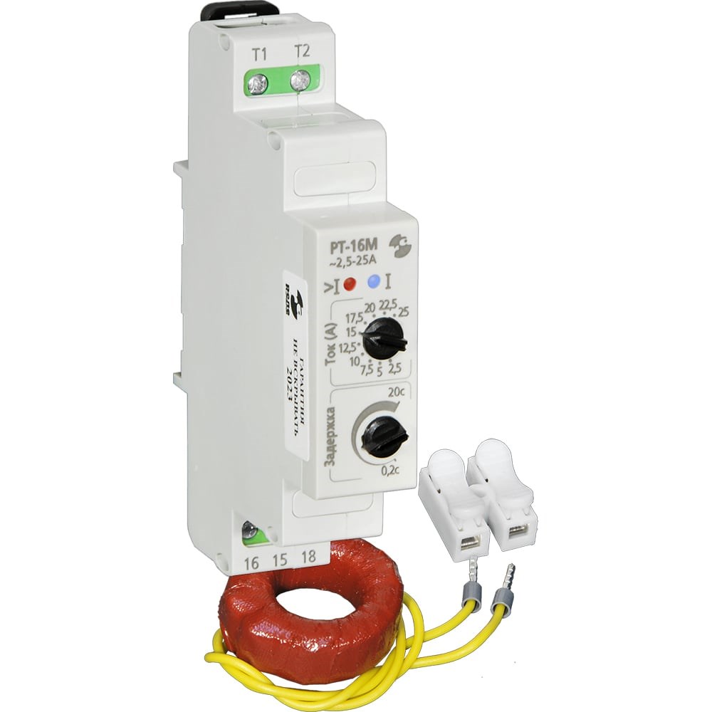 Реле тока Реле и Автоматика, РТ-16М 2,5-25А, выносной датчик тока A8222-34126213 предназначено для контроля тока в электрических цепях. Срабатывание реле происходит с регулируемой временной задержкой при величине тока выше установленного значения.На лицевой панели расположены: синий индикатор наличия тока, красный индикатор превышения тока, регулятор задержки времени срабатывания реле и регулятор тока срабатывания.Особенности:Питание осуществляется от провода с контролируемым током, который пропускается через выносной трансформаторКонтакты: 1 переключающий (16А)Диапазон контролируемого тока: 2,5 -25 А
