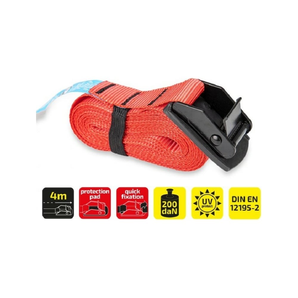 Ремень для крепления багажа Heyner быстрый зажим, 25 мм x 4 м 880400 обладает следующими свойствами: Нагрузка: 200 кг/сила (кгс). Защита груза от повреждений и царапин благодаря резиновой прокладке под пряжкой. Растягивается меньше 7%. Устойчив к уф-лучам и влаге. Материал: полиэстер. Цвет: красный.