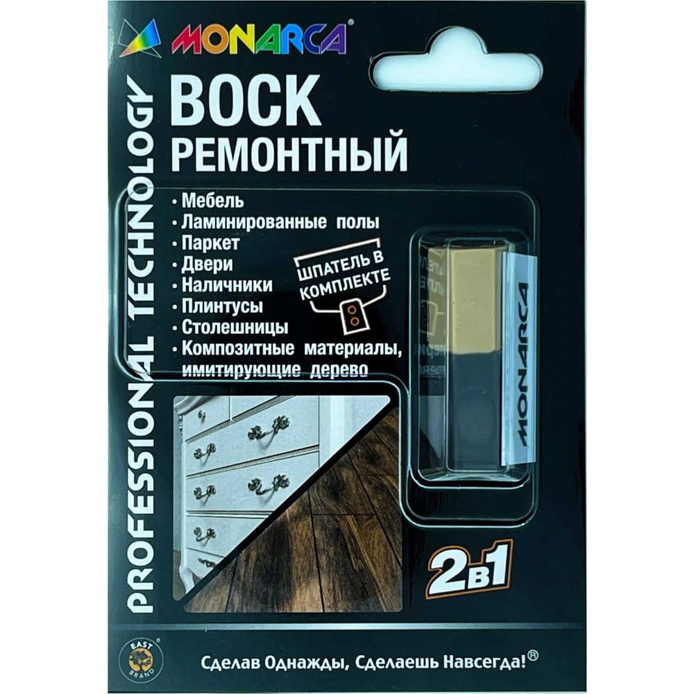 Воск ремонтный предназначен для домашнего и профессионального устранения дефектов, сколов, прочих повреждений на деревянных, ламинированных и пластиковых поверхностях. Оптимальная твердость гарантирует высокие эксплуатационные показатели на стойкость, выгорание и истирание. Укомплектован шпателем для нанесения, заполнения и Выравнивания. Уникальный формат 2в1 позволяет смешивать воски для подбора точного оттенка.Область примененияРемонт и реставрация мебели, дверей и коробов, наличников, ламинированных полов, паркета, плинтусов, окон, любых изделий из дерева, пластика, композитных материалов, имитирующих дерево.