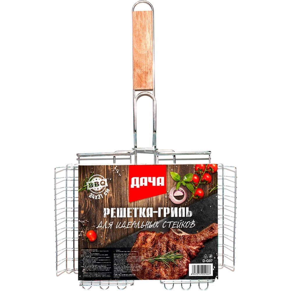 Решетка-гриль ДАЧА объёмная предназначена для приготовления мяса, птицы, рыбы, овощей на углях. Подходит для мангалов и барбекю. Размер рабочей поверхности 24х31см. Состав: сталь с коррозионностойким покрытием, дерево.