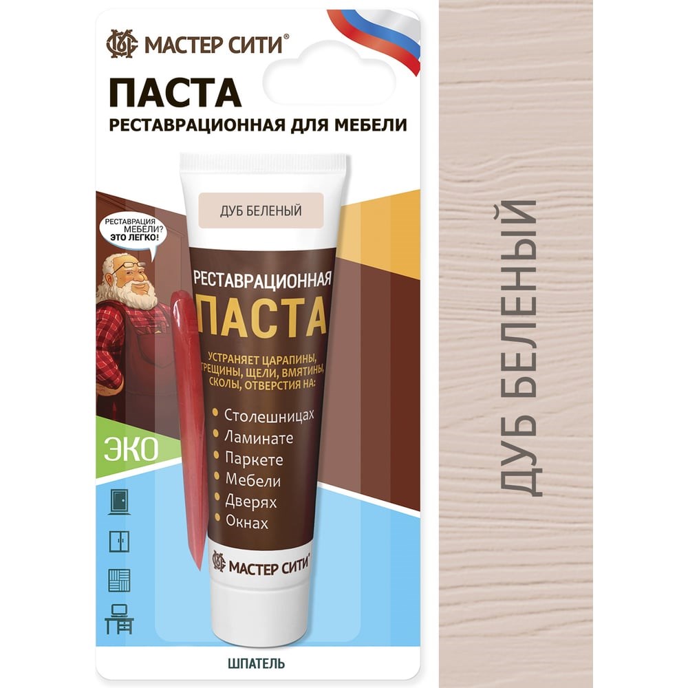 Шпатлевка для ремонта мебели, напольных покрытий, ламината, изделий из ЛДСП, МДФ, массива дерева, шпатлевка по пластику, для искусственного камня. Также применяйте для пластика, пластиковых поверхностей. Шпаклевка по дереву (замазка) восстанавливает внешний вид изделия, продлевает срок использования. Мебельная шпатлевка (реставрационная паста) — густой эластичный состав, заполняет средние и глубокие повреждения до полного выравнивания поверхности в цвет изделия. Шпаклевка для мебели легко наносится, прочно и надолго закрепляется в повреждении, устойчива к деформации, не дает усадки и не выцветает со временем, без запаха. Для защиты от грязи и пыли рекомендуем покрыть место реставрации Лаком быстросохнущим Мастер Сити. Обращаем внимание, что после высыхания и при нанесении лака цвет пасты меняется. После высыхания паста светлеет на 2-3 тона, а после нанесения лака, темнеет на 4-5 тонов. Палитра реставрационной пасты в трех состояниях (до высыхания, после высыхания, и под лаком) представлена в карточке товара. На лицевом фото изображен цвет пасты после высыхания (без лака). Экран может искажать цвет продукта. Проверяйте цвет на экранах 2х устройств. Рекомендуем сделать пробное нанесение. Дополнительно рисунок дерева можно восстановить Маркером Мастер Сити. Инструкцию читайте на упаковке. ПЕРЕД ПРИМЕНЕНИЕМ ТЩАТЕЛЬНО РАЗОМНИТЕ ТУБУ для перемешивания компонентов. Расслаивание компонентов при хранении не является дефектом.