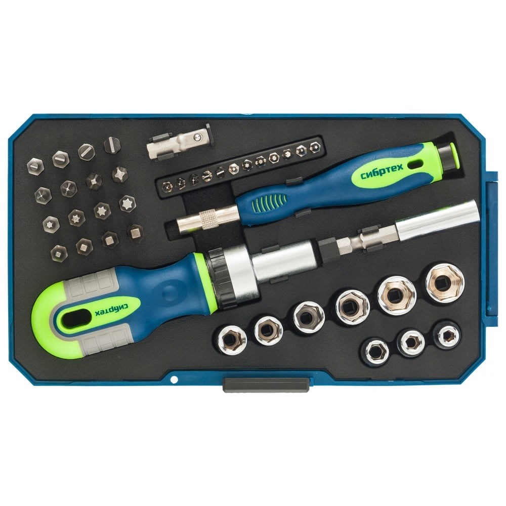 Реверсивные отвертки с набором бит и торцевых головок Сибртех 13338, 41 предмет, CrV, включает в себя насадки для работы с крепежом типа SL, PH, PZ, HEX, TORX и торцевые головки для монтажа/демонтажа гаек, болтов, саморезов. Также в нем есть отвертка и биты для точных работ, с помощью которых можно осуществить ремонт мелкой электроники, очков, детских игрушек и т.д. Удлинитель позволяет проводить работы в труднодоступных местах.