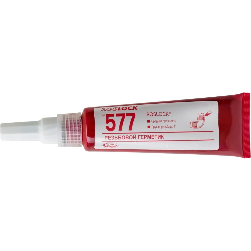 Резьбовой герметик ROSLOCK 577 предназначен для резьбовых гидравлических и пневматических соединений. Может использоваться на замасленных поверхностях. При сборке смазывает резьбу, не допуская задиров на алюминии, бронзе, латуни, нержавеющей стали. При разборке, возможно, понадобится нагрев. Резьба конусная, трубная 1/8" - 1", зазор в резьбе не более 0,25 мм. Свойства жидкого герметика Вязкость Брукфильду RVT при 25 °С: (A/6/2,5)7000 – 15000 мПа*с, (A/6/20)15000 – 35000 мПа*с Температура вспышки: > 172°С, не содержит растворителей Набор прочности Болт-гайка М10х1,5-6g/6H из стали марки 30 ГОСТ 1050 при (18 - 25) °С по ISO 10964: Ручная прочность (8 – 20) мин. Ручная прочность с активатором - до 5 мин. Функциональная прочность - через (3 – 6) ч Максимальная прочность - через 24 ч. Свойства отвержденного герметика Болт-гайка М10х1,5-6g/6H из стали марки 30 ГОСТ 1050 при (18 - 25) °С по ISO 10964: Момент страгивания (срыва) через 24 ч: (5 – 15) Н*м Момент отвинчивания через 24 ч: (5 – 10) Н*м Усилие выпрессовки (имитация сорванной резьбы): ≥ 5 МПа
