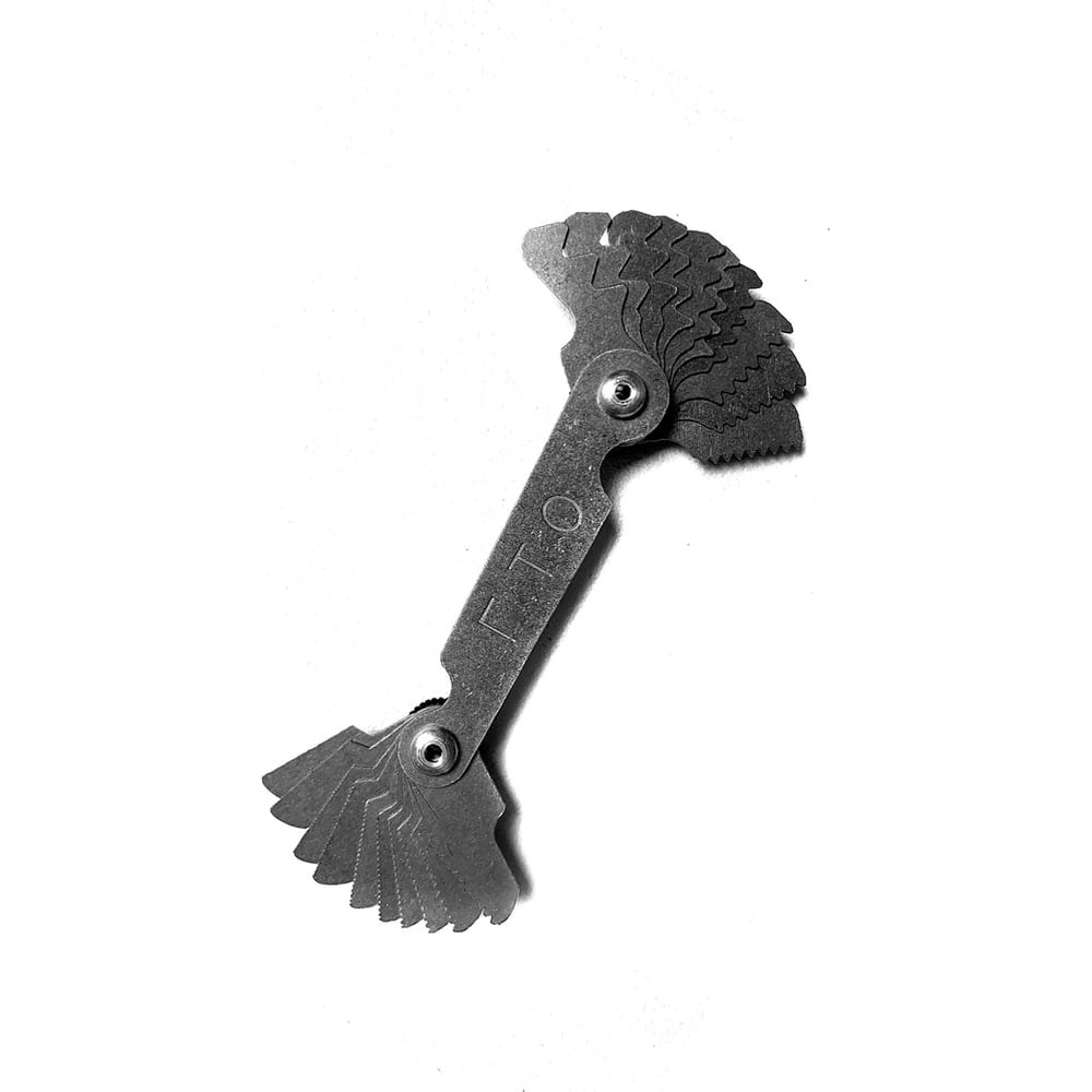 Резьбовой шаблон ГТО М60 SPG6001 предназначен для определения номинального шага витков резьбы с углом 60 градусов. Представляет собой набор пластин с эталонными зубцами. Конструкция позволяет свободно перемещать эталоны, а также доставать их из веера в случае необходимости. Пластины изготовлены из твердого сплава, отличаются долговечностью и устойчивостью к коррозии.