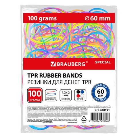Резинки банковские TPR универсальные, диаметр 60 мм, 100 г, ЯРКИЕ ЦВЕТА, BRAUBERG SPECIAL, 440191
