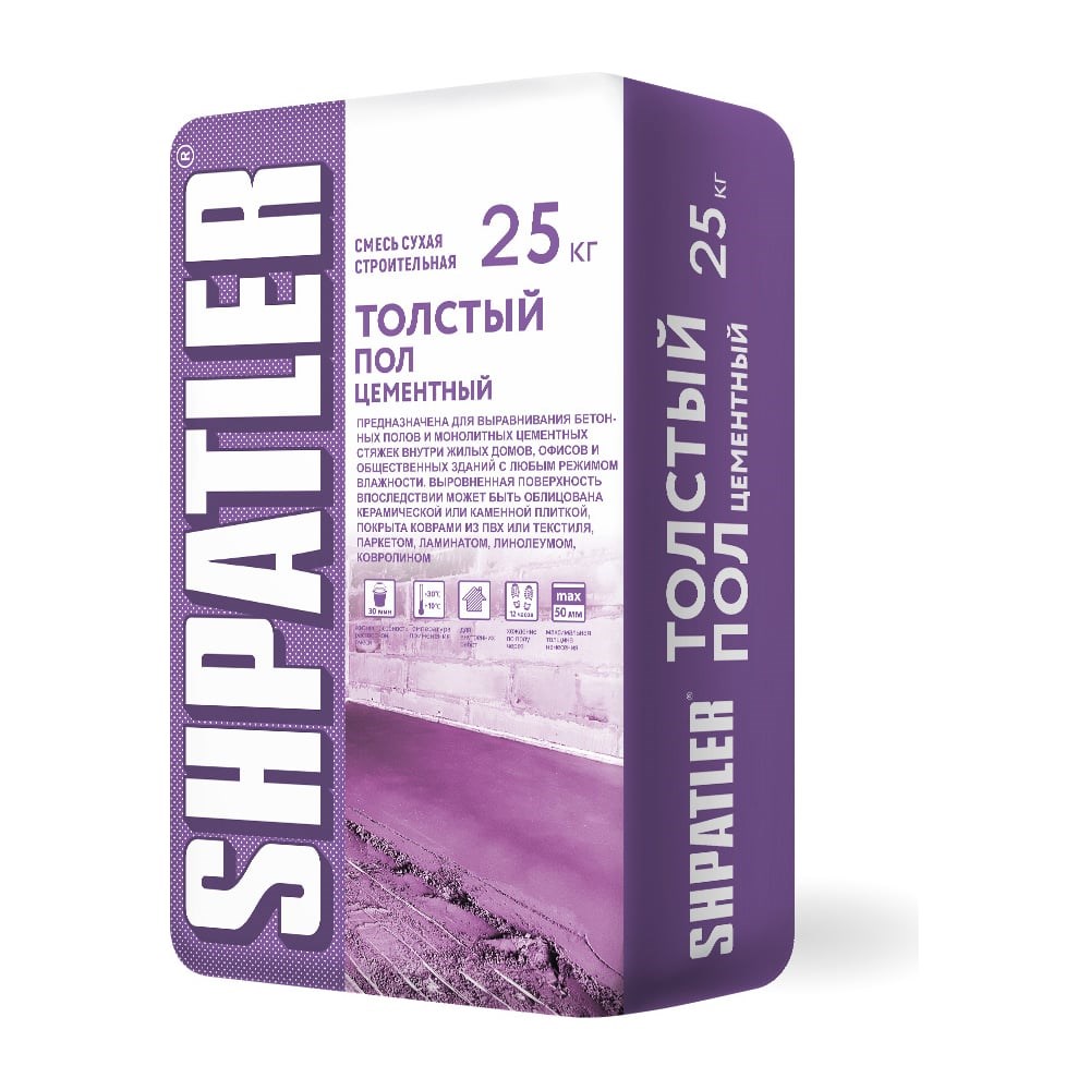 Ровнитель для пола Шпатлер Толстый пол 25 кг Ш00016 - это сухая смесь на основе быстросхватывающихся цементов, состоящая из минеральных наполнителей и модифицированная специальными добавками. Предназначена для выравнивания бетонных полов и монолитных цементных стяжек внутри жилых домов, офисов и общественных зданий с любым режимом влажности. Выровненная поверхность впоследствии может быть облицована керамической или каменной плиткой, покрыта коврами из ПВХ или текстиля, паркетом, ламинатом, линолеумом, ковролином, пробкой, а также может дополнительно выровнена самовыравнивающейся смесью (например "ШПАТЛЕР Тонкий Пол") в случае повышенных требований к качеству поверхности пола. Не подлежит окраске и не рекомендуется для использования без напольного покрытия. При смешивании с водой образует легко перерабатываемую подвижную растворную смесь, быстро растекающуюся по поверхности. При проведении работ и в течение последующих трёх суток необходимо обеспечить температуру воздуха от +10 до +30 градусов.