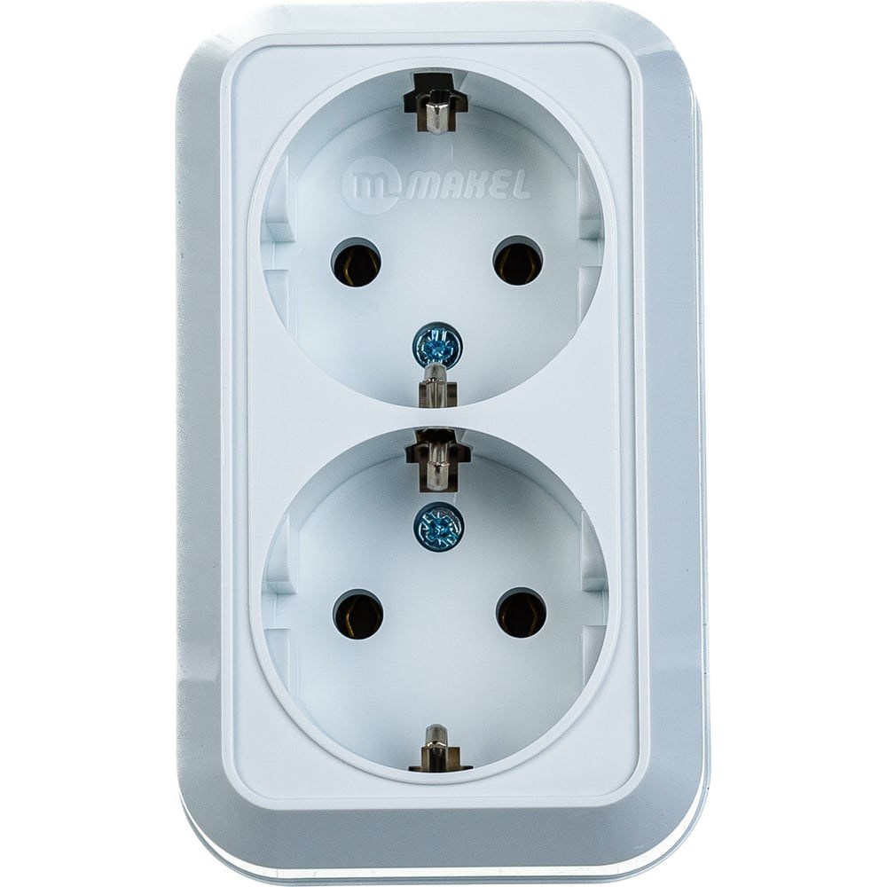 Двухместная накладная розетка Makel 45182 с заземлением изготовлена из термоустойчивого высокопрочного пластика. Розетка работает при напряжении в 250 В и максимальной силе тока в 16 А, а степень ее защиты равна IP 20. Изделие устанавливают на кухне, в коридорах и в кладовках.