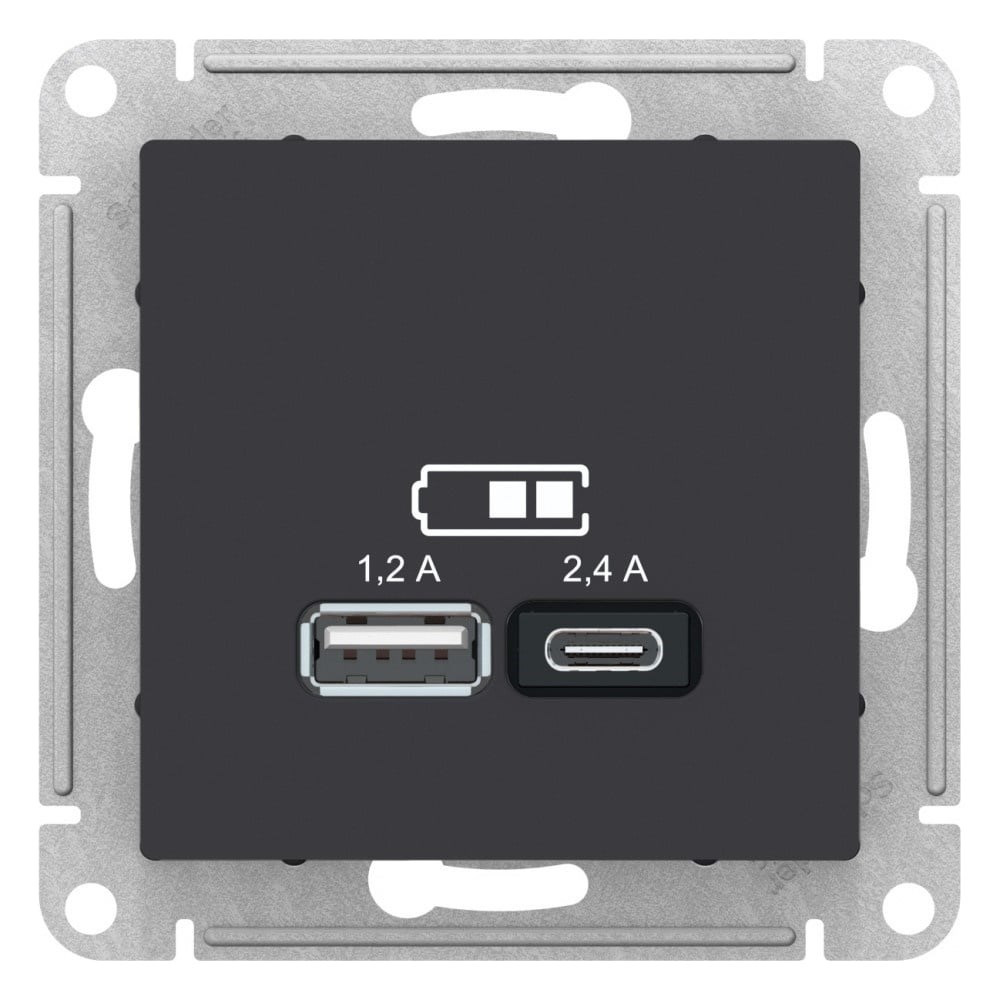 Розетка Systeme Electric (ранее Schneider Electric) серии AtlasDesign в цвете карбон двойная USB с разъемами типа A+Cсовременная USB-зарядка с двумя разъемамипозволяет заряжать как стандартные мобильные устройства через разъем типа А, так и новейшие устройства, в том числе ноутбуки, с разъемом типа С