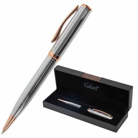 Корпус покрыт гравировкой и увеличивается к торцевой части. Клип позволяет фиксировать ручку на ежедневниках, блокнотах и карманах одежды. GALANT "Epsilon" оснащена поворотным механизмом, внутри которого расположен стержень. Диаметр наконечника составляет 0,7 мм, то есть ручка идеально подходит для быстрого стиля письма. Упакована в подарочный футляр.