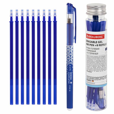 Ручка стираемая гелевая + 9 стержней в ПЛАСТИКОВОЙ ТУБЕ, СИНЯЯ, игольчатый наконечник 0,5 мм, линия 0,35 мм, BRAUBERG, 144093