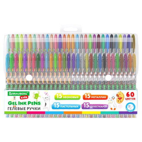 Ручки гелевые BRAUBERG KIDS "CUTE ANIMALS", НАБОР 60 ЦВЕТОВ, корпус с печатью, узел 1 мм, линия письма 0,7 мм, 144450