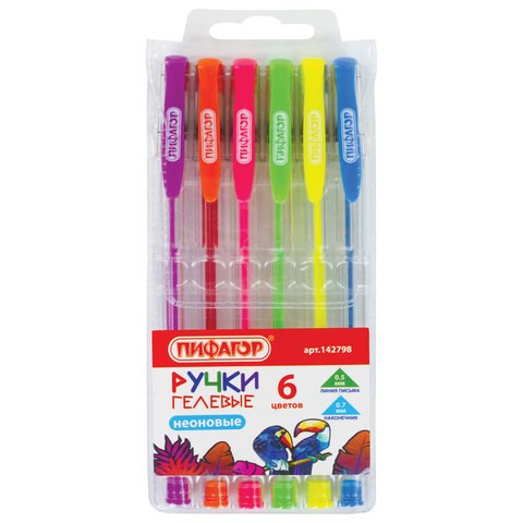 Ручки гелевые ПИФАГОР, НАБОР 6 ЦВЕТОВ, НЕОНОВЫЕ, корпус прозрачный, узел 0,7 мм, линия письма 0,5 мм, 142798