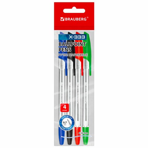 Ручки шариковые BRAUBERG "X-333", НАБОР 4 цвета, узел 0,7 мм, линия 0,35 мм, 144252