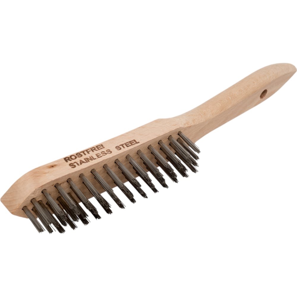 Ручные щетки предназначены для поверхностей из нержавеющих сталей, цветных металлов, сплавов алюминия. В основном применяются для зачистки от старой краски, стружки, обработки сварных швов и т.п. работ. Ворс из прямой нержавеющей стальной проволоки диаметром 0,30 мм агрессивен в работе. Используется для работ по нержавеющим сталям и цветным металлам. Материал корпуса: дерево Форма ручки: прямая Кол-во рядов ворса: 4 Длина корпуса L (мм): 295 Длина рабочая A (мм): 145 Материал ворса щетки: сталь нержавеющая Диаметр ворса (мм): 0,30 Тип (форма) ворса: прямой Длина ворса T, S (мм): 30