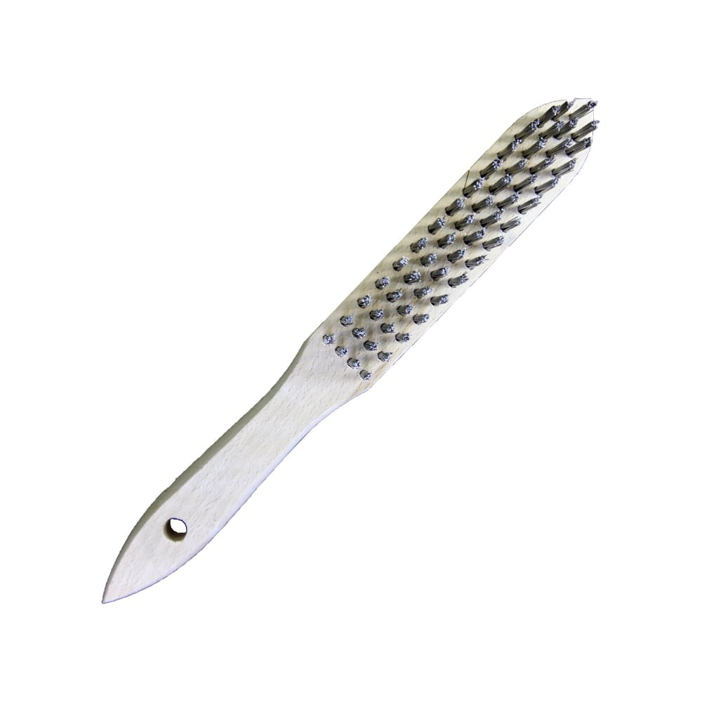 Ручные щетки предназначены для обработки металла, камня, бетона, дерева и других материалов. В основном применяются для зачистки от старой краски, удаления ржавчины, обработки сварных швов и т.п. работ. Ворс из прямой стальной проволоки диаметром 0,35 мм высоко агрессивен в работе. Материал корпуса: дерево Форма ручки: прямая Кол-во рядов ворса: 4 Длина корпуса L (мм): 295 Длина рабочая A (мм): 145 Материал ворса щетки: сталь черная Диаметр ворса (мм): 0,35 Тип (форма) ворса: прямой Длина ворса T, S (мм): 25