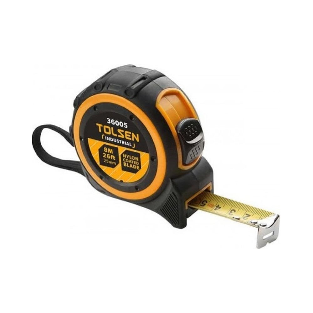 Рулетка TOLSEN ПРОФИ комбинированный корпус, полотно нейлон 8мх25 мм 36005 используется для проведения измерительных работ в строительстве и ремонте. Надежная конструкция рулетки оснащена защитой от удара в результате падения. Эргономичный двухкомпонентный корпус выполнен из ABS-пластика и термопластичной резины TPR. Это обеспечивает удобную работу и препятствует скольжению в руках. Миллиметровая и дюймовая шкала расширяет сферу применения. Дополнительное нейлоновое покрытие полотна обеспечивает гибкость и эластичность. Крючок с магнитами удобно фиксируется на измеряемой поверхности. Металлический плоский крючок позволяет удобно разместить рулетку на ремне или инструментальных сумках. Тканый ремешок служит для размещения на запястье.