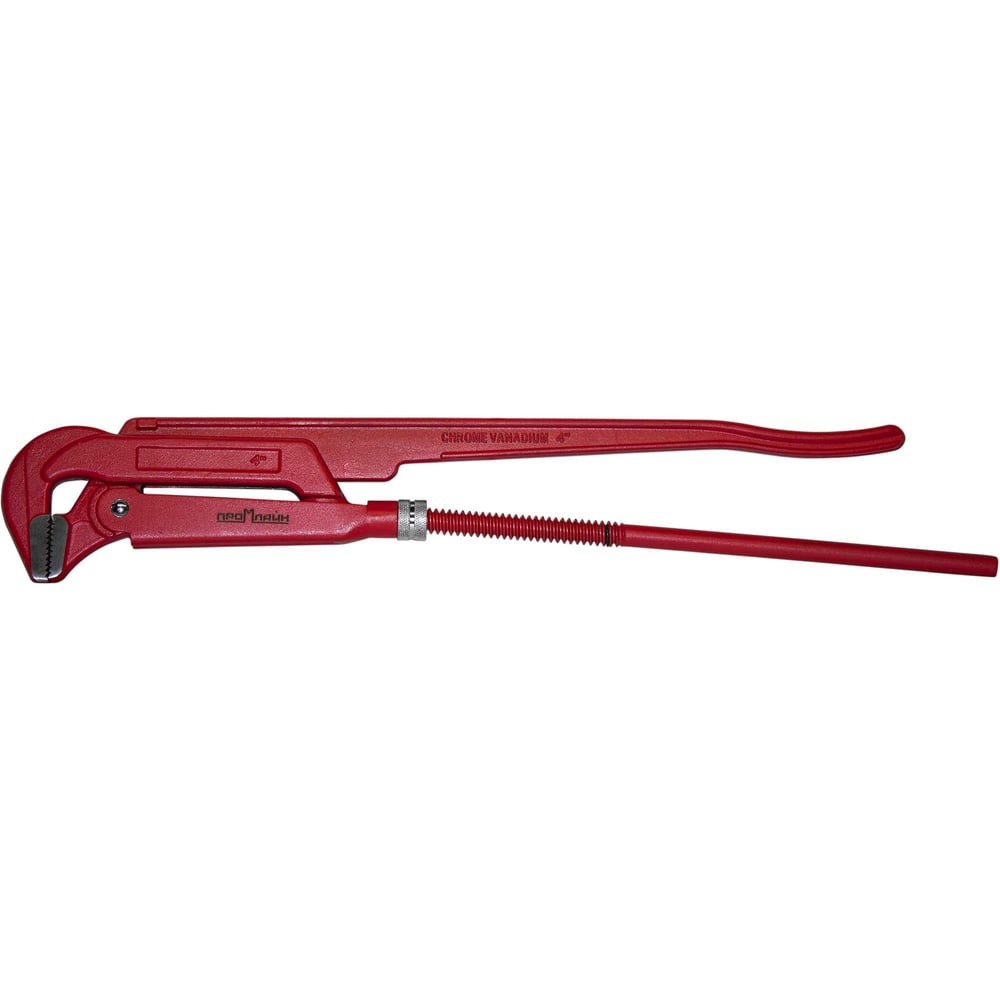 Ключ трубный рычажный шведский тип Промлайн необходим для вращения или фиксации труб и других деталей. Инструмент применяется для работ с соединениями, не имеющими специальных граней. Ключ имеет повышенный эксплуатационный ресурс, так как изготовлен из прочной хромованадиевой стали, устойчивой к деформации. Губки расположены под углом 90° к ручкам, что позволяет надежно зафиксировать деталь.