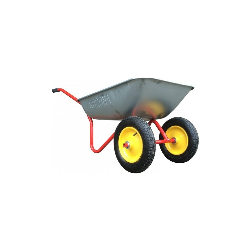 Садовая тачка Yard двухколесная, грузоподъемность 90 кг, объем 65 л 66-8-067 предназначена для перевозки различных грузов при проведении садовых, сельскохозяйственных, а также строительных и иных работ. Легкая и маневренная садовая одноколесная тачка позволяет легко перевозить груз по узким дачным дорожкам. Рама изготовлена из трубы диаметром 28 мм и толщиной профиля 1,2 мм. Кузов выполнен из оцинкованной стали, что обеспечивает высокую стойкость к коррозии и долговечность. Закругленные борта препятствуют выпадению содержимого. Тачка комплектуется пневматическим колесом с камерой. Наличие двух шариковых подшипников обеспечивает легкость перемещения тачки с грузом.