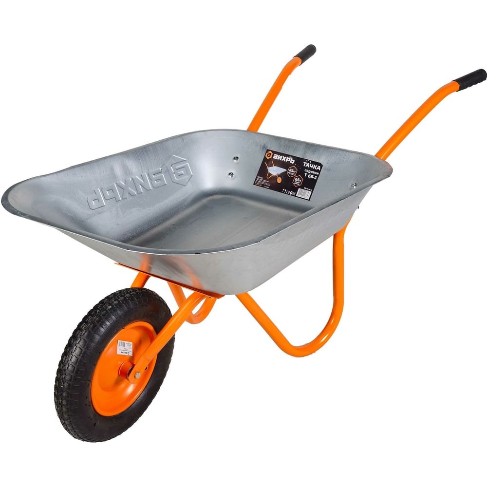 Модель классической садовой тачки с одним колесом Вихрь Т65-1 незаменимый инструмент среди владельцев приусадебных хозяйств. Объём её кузова составляет 65 л, а максимальная грузоподъёмность 85 кг. Толщина металла кузова 0.7 мм, чего вполне хватает для работ на даче, например, для перевозки мелкогабаритных, жидких или сыпучих грузов. Можно также перевозить песок, щебень и другие строительные материалы, по при этом следить чтобы они не привели к деформации кузова.Модель Вихрь Т65-1 оснащена пневматическим колесом диаметром 360 мм, установленным посредством подшипника и прорезиненными ручками, поэтому пользоваться этой садовой тачкой удобно. Колесо хорошо демпфирует колебания при езде по неровной дороге. Тип колеса – 3.25-8,360. Тачка поставляется в разобранном виде. В комплектацию входят: две ручки, кузов, колесо, опорная пластина и комплект крепежей для сборки. Тележка собирается на болтовых соединениях, обеспечивающих прочность конструкции. Вес тележки – 7.8 кг.