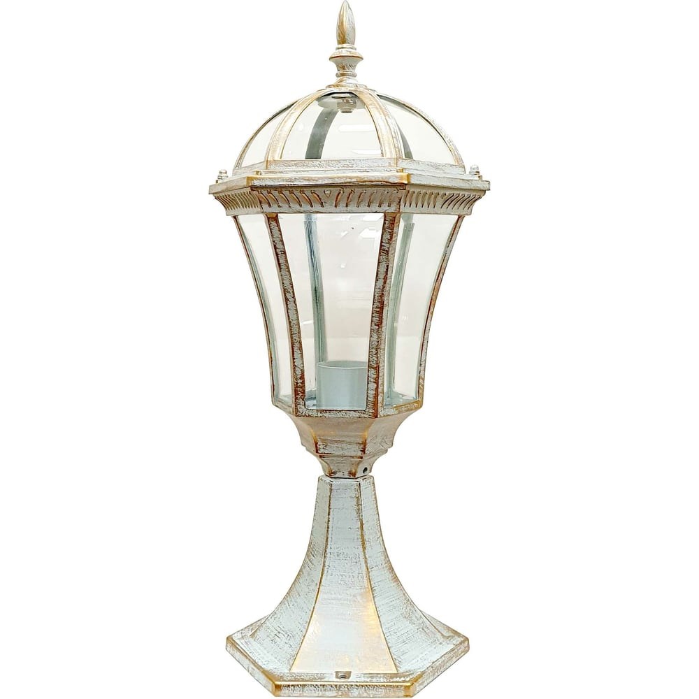 Садово-парковый светильник De Fran Е27 60Вт IP44 белый с золотом, EL-640P2 wg серии Дворянский, выполненный в классическом стиле, предназначен для освещения садово-парковых и придомовых территорий, в том числе для установки на заборные тумбы и крыльцо. Корпус светильника, изготовленный из литьевого сплава алюминия, долговечен и устойчив к воздействию неблагоприятных факторов окружающей среды. Большое количество стекол в конструкции светильника уменьшает потери света на металлических деталях и увеличивает зону освещения.