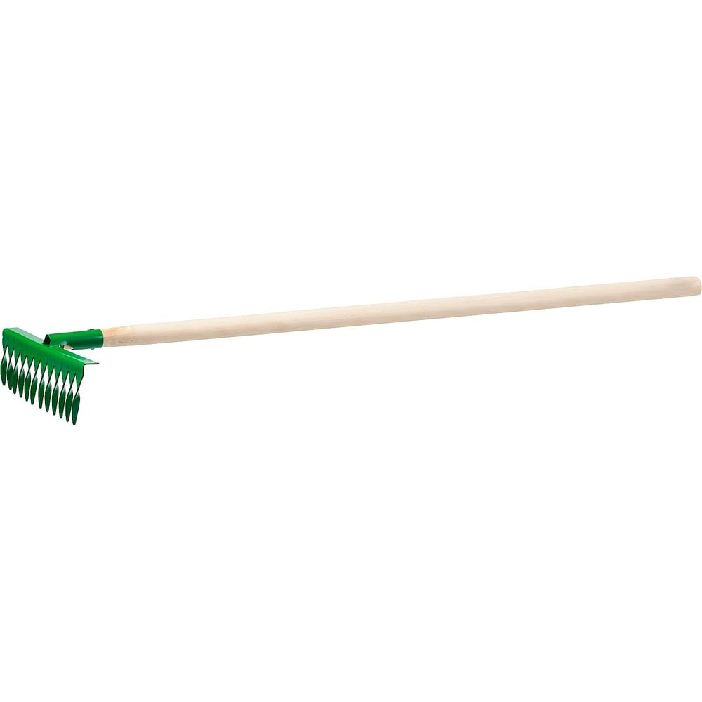 Садовые грабли с черенком РОСТОК 12 витых зубцов 421900-12 используются для выравнивания грунта, а также очистки садовых участков от различного мусора, скошенной травы и опавших листьев. Рабочая часть из прочной стали устойчива к деформации. Порошковая краска оберегает инструмент от коррозии. Широкие зубья надежно удерживают собранный мусор, позволяя убрать территорию за один проход. Деревянный черенок обеспечивает удобный хват.