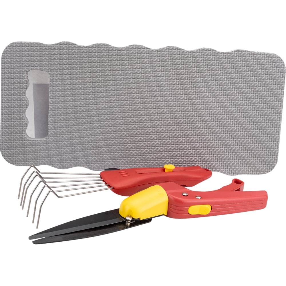 Cадовый набор GRINDA: ножницы для стрижки травы, подколенник, грабельки 8-422035 предназначен для ухода за вашим газоном. В набор входят ножницы с поворотным механизмом для стрижки травы, подколенник для удобства работы из водостойкого пластика и веерные раздвижные грабельки для уборки срезанной травы.