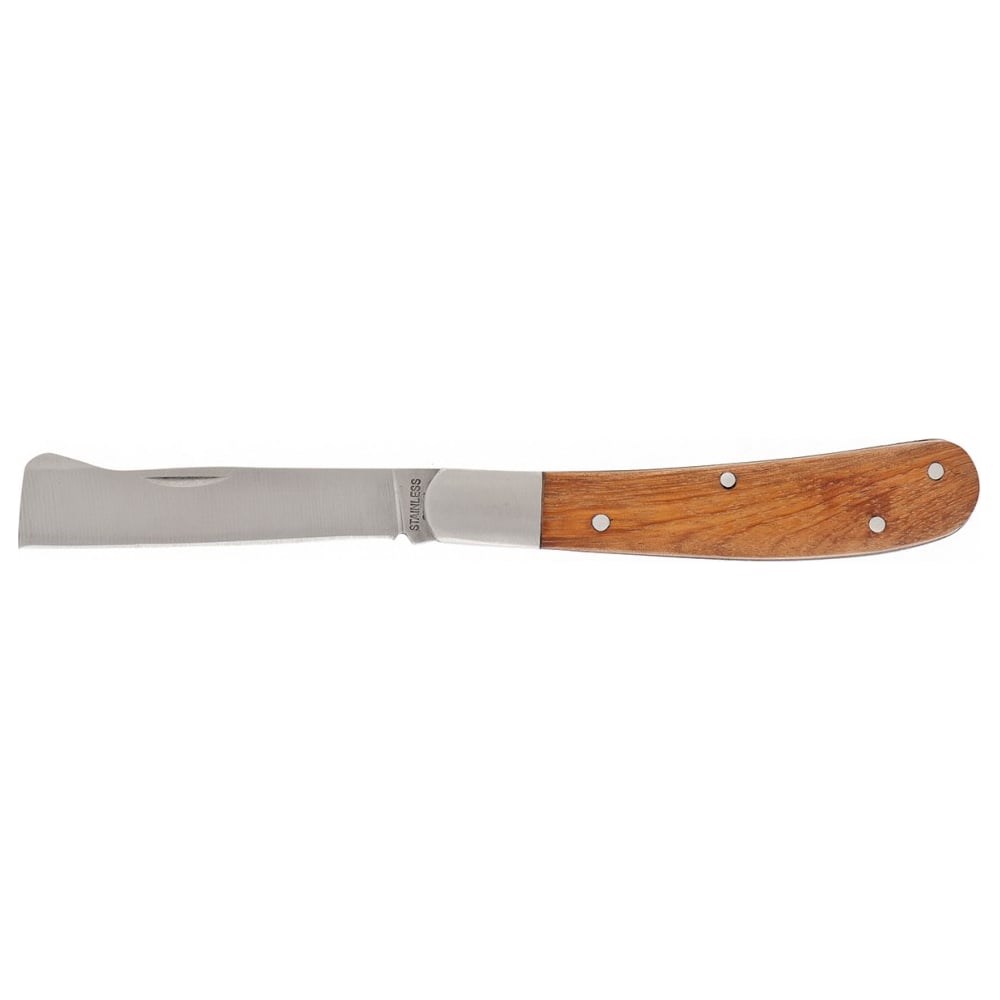 Садовый складной копулировочный нож Palisad 79002 длиной 173 мм, с деревянной рукояткой, используется для прививки черенком, что значительно повышает скорость срастания подвоя и привоя. Лезвие специальной формы с выступом на спинке позволяет легко отодвигать кору при прививке. Также его можно применять для обрезки веток или брать с собой в качестве туристического ножа. Для сохранения остроты лезвия после каждого применения следует протирать его салфеткой и смазывать маслом.