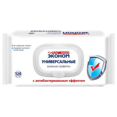 Салфетки влажные 120 шт., ЭКОНОМ SMART, антибактериальные, крышка-клапан, 30648