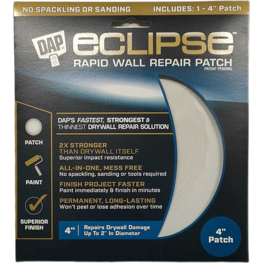 Патч (заплата) для быстрого ремонта стен Eclipse — это уникальное и инновационное изделие для ремонта гипсокартонных стен и потолка. Не требуются шпатлевание и шлифовка. Просто наклейте патч DAP Eclipse на поврежденный гипсокартон покрасьте его. Это не только универсальное решения для быстрого и чистого ремонта, но и материал, который обеспечивает превосходную ударопрочность в местах, где могут возникать повторяющиеся удары (например, за дверью). самое быстрое и прочное решение для ремонта, поврежденного гипсокартона в 4 раза прочнее самого гипсокартона превосходная ударопрочность ремонт без беспорядка не требуется шпатлевание, шлифовка и дополнительные инструменты можно сразу окрашивать, что позволяет быстро закончить ремонт не осыпается и не теряет адгезию