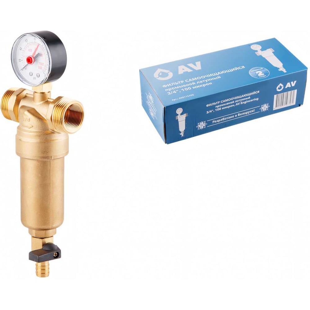 Магистральный фильтр AV Engineering самопромывной 3/4", 100 мкм с манометром AVE115702 с сеточным картриджем из нержавеющей стали, 100 микрон. Используется для горячей воды. Максимальная рабочая температура - 100 °С.