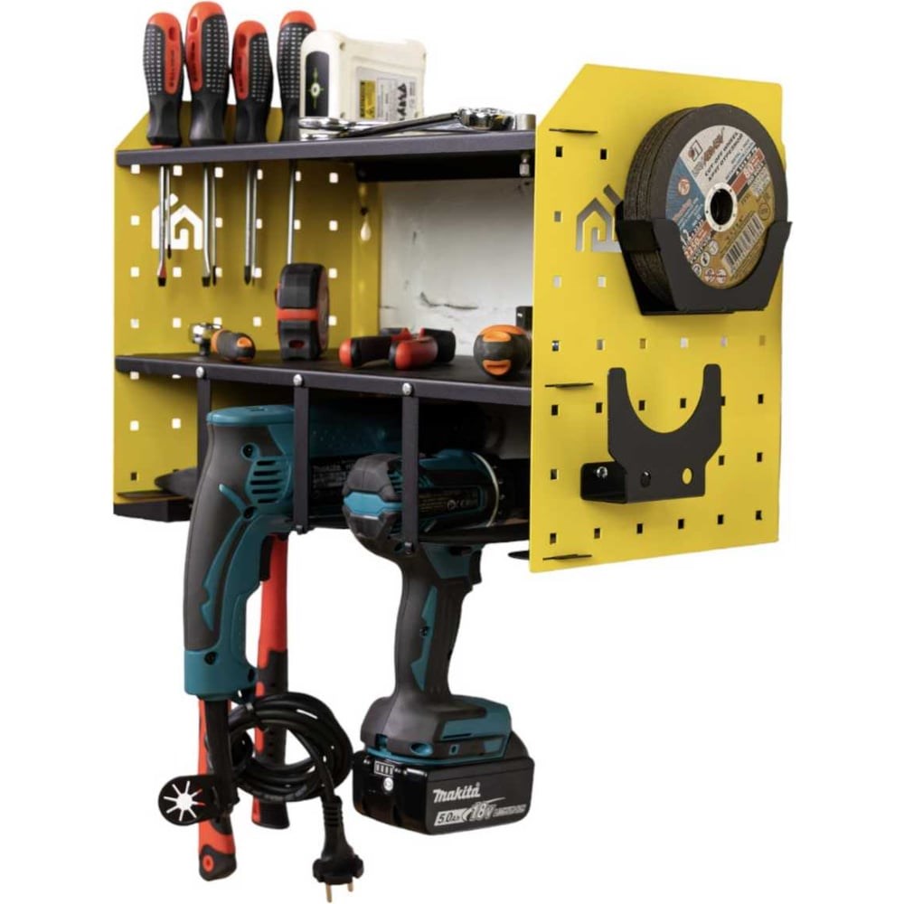 Удобный настенный органайзер предназначен для хранения электроинструмента: Шуруповерт Дрель Перфоратор Гайковерт Эксцентриковая шлифовальная машина Электрогайковерт Болгарка на 125 -150 мм Для хранения аккумуляторных инструментов предусмотрены отдельные отсеки, что позволяет соблюдать порядок в гараже, мастерской даже при большом количестве инструментов. Второй ярус полки предназначен для хранения ручного инструмента: кианка, молоток, пассатижи, кусачки, набор гаечных ключей, угольник, уровень, лазерный уровень, рулетка. Отверстия на верхней полке предусмотрены для хранения: торцевых, крестовых, диэлектрических отверток, бит, фрез, зенковка, сменных насадок. На верхнюю полку можно поставить станцию зарядки электроинструмента. В конструкции навесного органайзера предусмотрено отступление от стены, чтобы шнуры и кабели различных длин не мешались, а проходили вдоль стены. Перфорированная панель с двух сторон стеллажа предназначена для подвесов: - держатель для УШМ; - держатель для отрезных дисков; - держатель для сверл; - дополнительный ящик для метизов, болтов и мелочей. Подвесной ящик выполнен из стали марки х/к ст08псГ. Система хранения разработана специально для гаража и мастерской с учетом потребностей профессионалов. Наведите порядок с помощью этой функциональной системы хранения для инструментов!