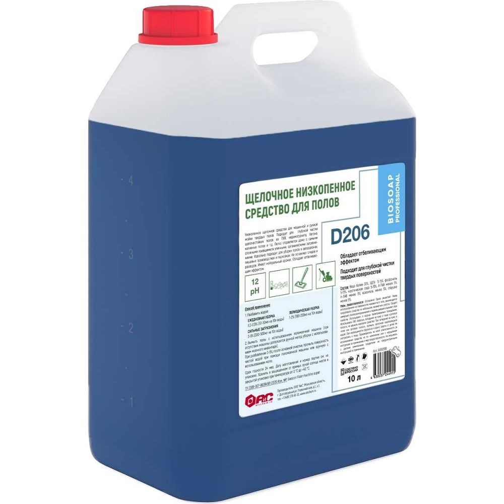 Низкопенное щелочное средство для машинной и ручной мойки твердых полов АиС BIOSOAP Proffecional / D206 5л 9060395 подходит для глубокой чистки щелочестойких полов из ПВХ, керамогранита, бетона, наливных полов и т.д. Легко справляется даже с самыми сложными въевшимися уличными, органическими загрязнениями. Идеально подходит для уборки полов в автосалонах, пищевых производствах и парковках. Не оставляет следов и разводов. Имеет нейтральный аромат. Обладает отбеливающим эффектом. Применение:Разбавить водой: ЕЖЕДНЕВНАЯ УБОРКА 0,3-0,5% (30-50мл на 10л воды), ПЕРИОДИЧЕСКАЯ УБОРКА 1-2% (100-200мл на 10л воды); СИЛЬНЫЕ ЗАГРЯЗНЕНИЯ 3-5% (300-500мл на 10л воды).Вымыть полы с использованием поломоечной машины (при отсутствии машины допускается ручной метод уборки с использованием моечного инвентаря). При разбавлении 3-5%, после основной очистки, промыть поверхность чистой водой при помощи поломоечной машины или вручную с использованием мопа.