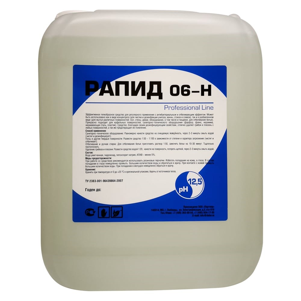 Рапид 06-Н - средство для регулярного применения с антибактериальным и отбеливающим эффектом. Предназначено для мытья и дезинфекции полов, стен, санитарно-технического оборудования, тары, емкостей, разделочных столов, инвентаря, технологического оборудования, а также для отбеливания и антибактериальной обработки уборочного инвентаря.Удаляет загрязнения, грибок и плесень в различных поверхностей. Благодаря гелеобразной консистенции долго удерживается на вертикальной поверхности.Средство может быть использовано для очистки и антибактериальной обработки канализационных труб. В концентрации 1:100 активно подавляет жизнедеятельности микроорганизмов.Способ примененияСанитарно-техническое оборудование (антибактериальная обработка, удаление плесени, отбеливание): равномерно нанести средство на очищаемую поверхность, через 3-5 минут смыть водой. В случае сильных загрязнений оставить на более длительное время.Полы и другие твердые поверхности: развести водой 1:50-1:100 в зависимости от степени и характера загрязнения.Очистка и дезинфекция канализационных труб: аккуратно влить 150-250 мл в канализационное отверстие, оставить на 15-30 минут, промыть горячей водой.
