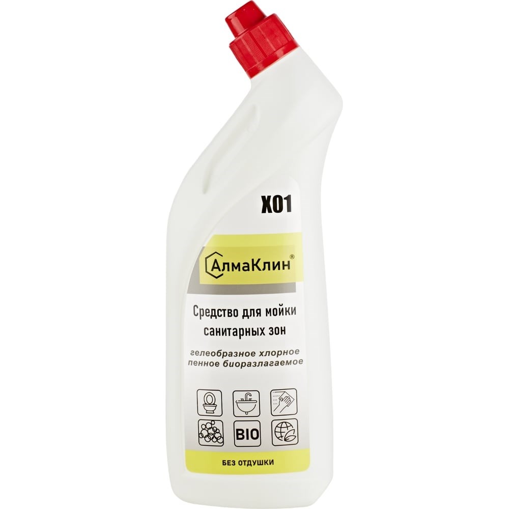 Щелочное моющее средство для санузлов ООО "БАЗОВАЯ ДЕЗИНФЕКЦИЯ" АлмаКлин X01, с активным хлором, 0.75 л, со скошенным носиком X01-0,75Л предназначено для интенсивного ухода и чистки санитарных помещений. Эффективно удаляет различные минеральные загрязнения, известковый налет, ржавчину и остатки мыла. Средство можно применять на всех щелочестойких поверхностях, таких как: плитка, фарфор, нержавеющая сталь, анодированный металл, пластик.