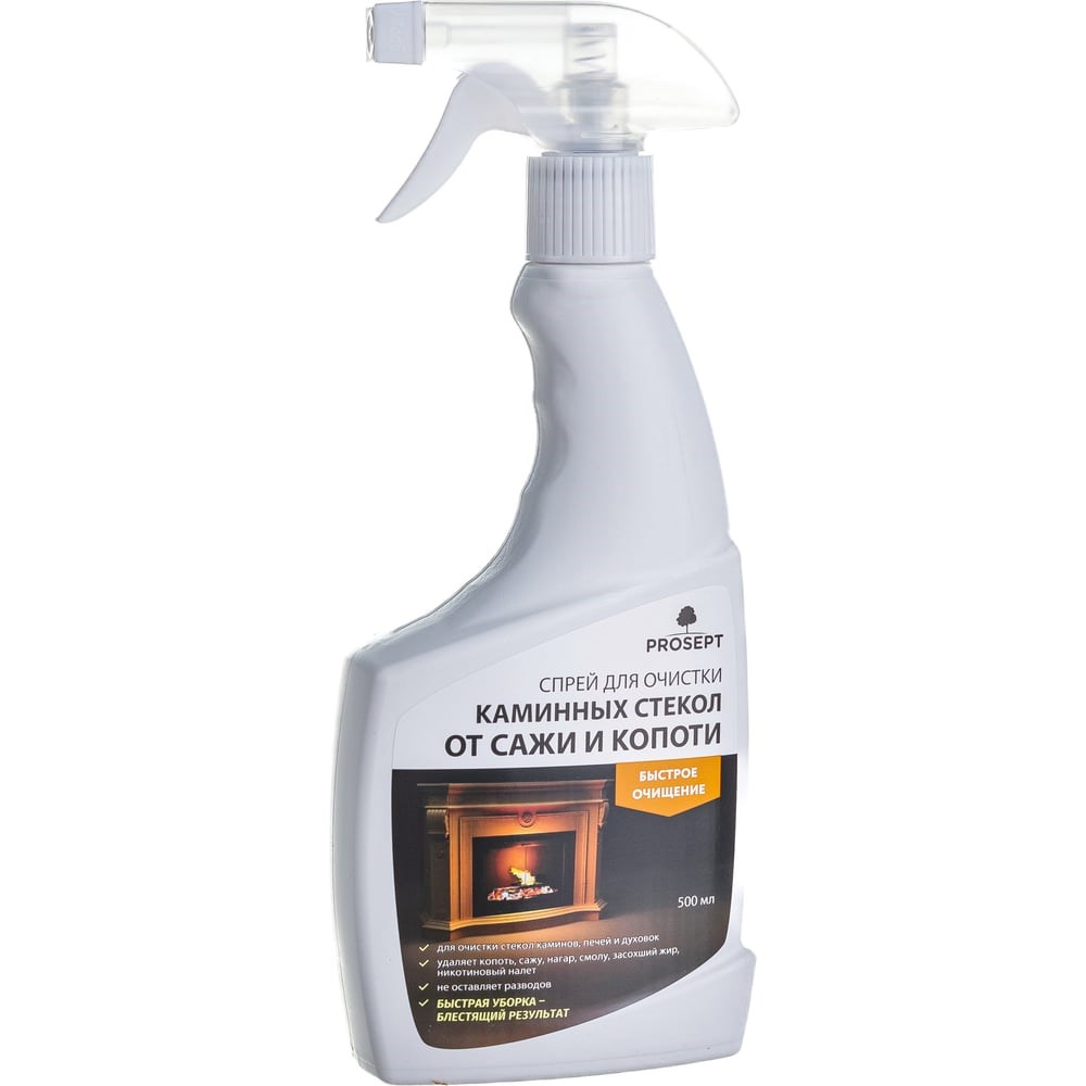 Спрей для очистки каминных стекол от сажи и копоти PROSEPT Universal Hard 0.5 л 263-05 средство для очистки термостойкого стекла (каминного и печного), облицовочного кирпича и других элементов камина от сажи и копоти. Удаляет сильные загрязнения: копоть, слои сажи, нагара, смолы и засохшего жира, никотиновый налет. Не оставляет разводов, образует защитную пленку, способствующую сохранению чистоты поверхности. Назначение: Подходит для чистки мангалов, коптильных камер, фритюрниц, грилей и жароварочных плит. Применять только на холодных печах/каминах! Примыкающие поверхности необходимо защитить от попадания средства. Равномерно распылить средство на загрязненную поверхность, оставить для воздействия на 3-4 минуты. Собрать загрязнения мокрой губкой, смыть водой, затем протереть сухой салфеткой. При необходимости повторить. ВНИМАНИЕ! Не использовать на алюминиевых, цинкованных и лакированных поверхностях.
