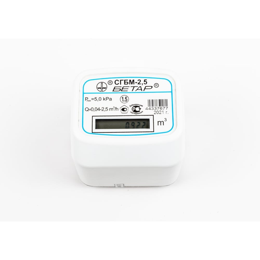 Счетчик газа Бетар СГБМ-2.5 Бет.2.5 предназначен для измерения объема газа для одной газовой плиты с четырьмя конфорками и одной духовки в жилищно-коммунальном и бытовом хозяйстве. Этот счётчик предназначен для установки в бытовых помещениях с целью учёта проходящего газа. Он способен работать в системе, имеющей нагрузку в виде четырёх конфорочной плиты. Он надёжно работает в интервале температур от -10°С до +50°С при влажности воздуха не превышающей 95%. Характеристики и принцип действия В основу работы прибора заложен принцип формирования акустических колебаний проходящей газовой смеси и последующего преобразования в электрический сигнал благодаря пьезоэлектрическому эффекту. Межповерочный интервал Для счётчика установлен межповерочный интервал равный 12 годам с момента начала эксплуатации. Как снять показания Счётное устройство этого устройство выполнено на базе жидкокристаллического индикатора. Показания разрядов индикатора учитываются только слева от точки(красный прямоугольник). Они отображают расход в кубических метрах. Показания справа от точки в отчётных документах не учитываются.