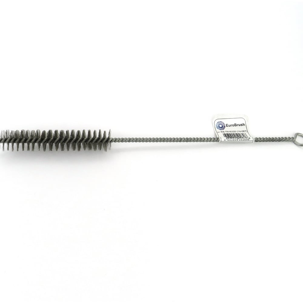 Щетки ерши диаметром от 4 до 25 мм с ручкой и кольцом, ворс из нержавеющей стальной проволоки, длина рабочая 100 мм, общая длина 300 мм, применяются для очистки цилиндрических поверхностей из нержавеющей стали, сплавов алюминия, отверстий, прочистки трубок, шлангов, удаления заусенцев и подобных работ. Наименование краткое: Щетка ерш Д20 мм нерж сталь для очистки отверстий трубок шлангов Модель: (код 14-067) Назначение: Очистка Обрабатываемый материал: Нержавеющая сталь / Алюминий Электроинструменты / станки: Вручную Диаметр D, Д (мм): 20 Размер A, E (мм): 100 Размер T, S (мм): 8 Материал ворса щетки: Сталь нержавеющая Диаметр ворса (мм): 0,15 Тип (форма) ворса: Гофрированный (волнистый) Производитель: EuroBrush Страна: Китай
