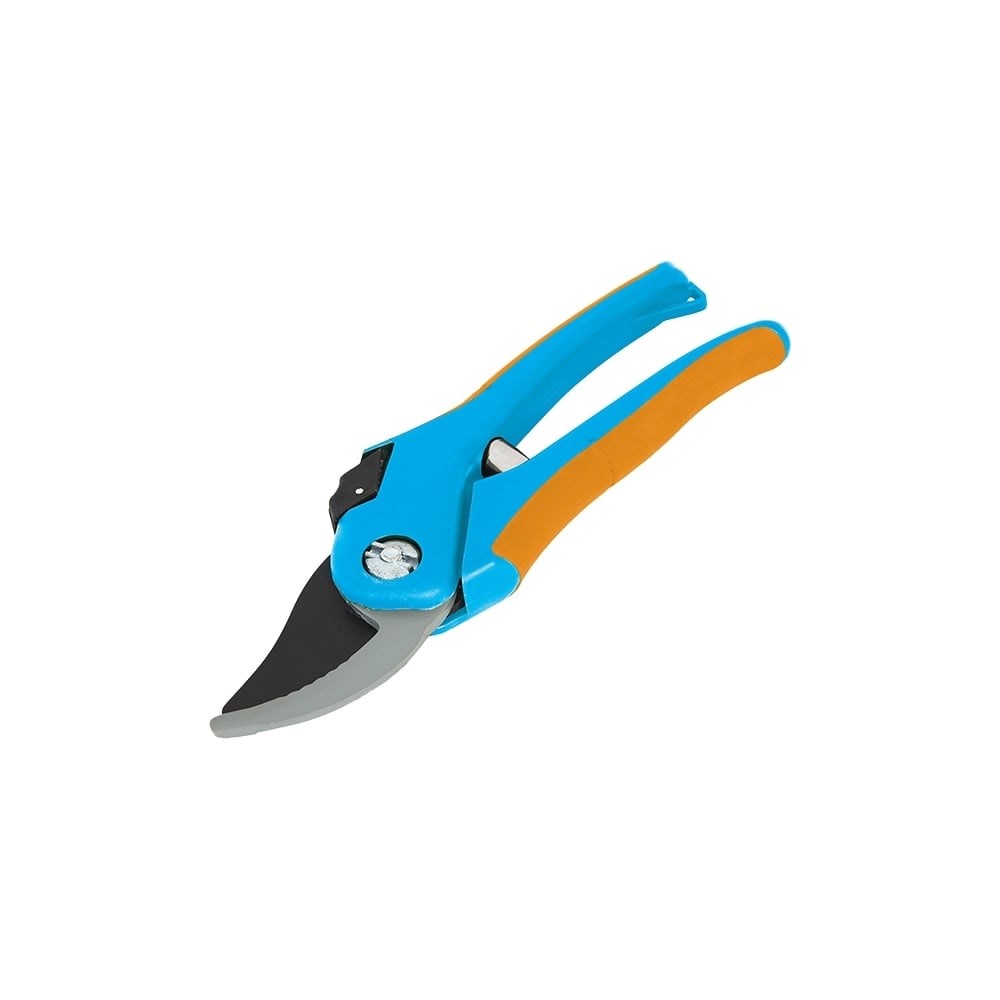 Секатор используется для ухода за садовыми кустарниками и цветами. Эргономичные, двухкомпонентные рукоятки обеспечивают надежный хват. Лезвия имею тефлоновое покрытие, что уменьшает прилипание древесного сока и мелких частиц древесины при совершении реза. Наличие фиксатора позволяет безопасно хранить и переносить секатор.